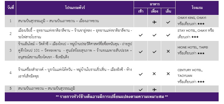 18.10 เดินทางถึง สนามบินเถาหยวน สาธารณรัฐจีน (ไต้หวัน) หลังจากนั้นนำท่านผ่านขั้นตอนการตรวจคนเข้าเมือง รับสัมภาระ (เวลาท้องถิ่นเร็วกว่าประเทศไทย 1 ชั่วโมง) พร้อมออกเดินทางสู่ เมืองเถาหยวน (Taoyuan) เมืองเถาหยวนเป็นเมืองที่มีรูปร่างแคบยาวไปตามที่ราบสูงตะวันตกเฉียงเหนือของเกาะไต้หวัน ขนาบข้างด้วยกรุงไทเปและนครอี๋หลาน ที่นี่เต็มไปด้วยความหลากหลายทางวัฒนธรรมพร้อมกับแหล่งท่องเที่ยวทางธรรมชาติมากมายให้คุณเที่ยว ที่นี่ได้รับฉายาว่าเป็น “อาณาจักรดอกไม้” และ “ดินแดนแห่งหนึ่งพันบ่อน้ำ”
