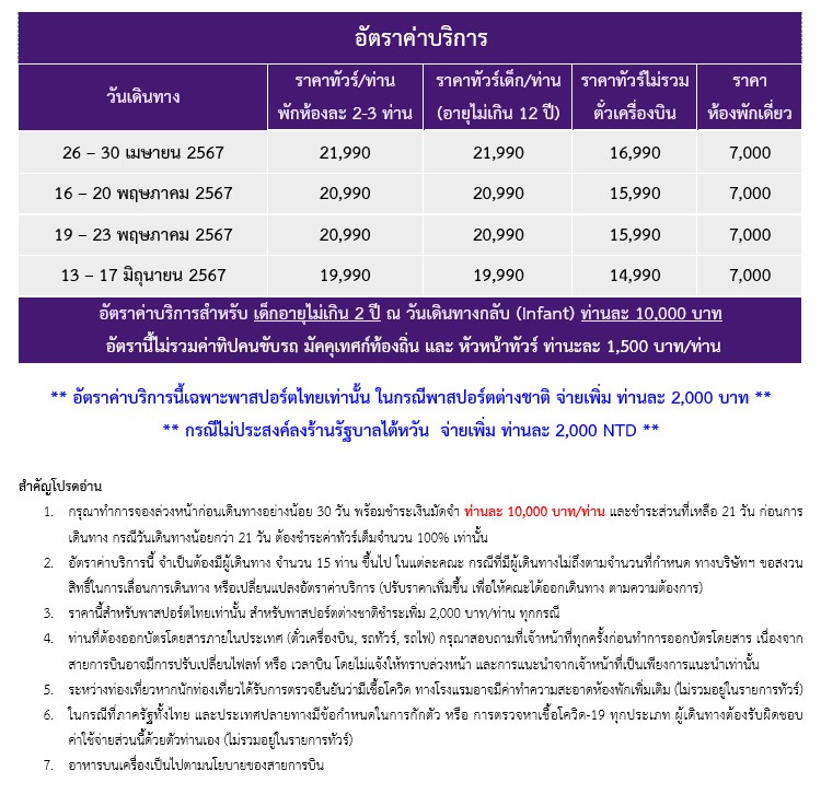 10.30 นัดหมายพร้อมกันที่ สนามบินสุวรรณภูมิ ชั้น 4 อาคารผู้โดยสารขาออก เคาน์เตอร์สายการบิน STARLUX AIRLINES (JX) โดยมีป้ายต้อนรับ เลทส์โกกรุ๊ป และมีเจ้าหน้าที่คอยอำนวยความสะดวกพร้อมแนะนำข้อมูลในการเดินทางให้แก่ท่าน