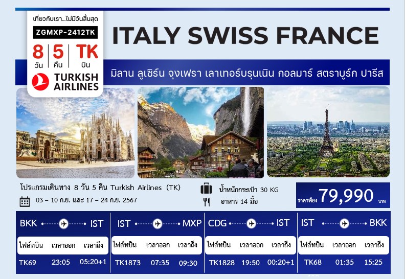 07.35 นำท่านออกเดินทางสู่ สนามบินมิลาโน มัลเปนซา ประเทศอิตาลี โดยสายการบิน Turkish Airlines เที่ยวบินที่ TK1873 (บริการอาหารและเครื่องดื่มบนเครื่อง)