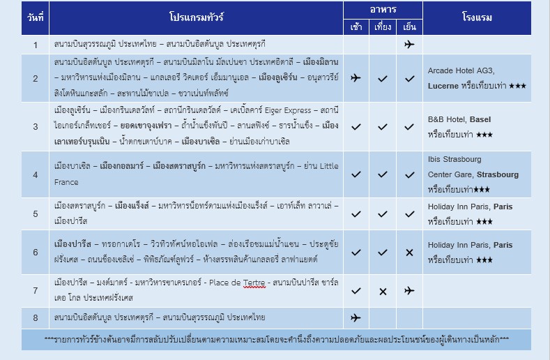 Day2 สนามบินอิสตันบูล ประเทศตุรกี – สนามบินมิลาโน มัลเปนซา ประเทศอิตาลี – เมืองมิลาน – มหาวิหารแห่งเมืองมิลาน – แกลเลอรี วิคเตอร์ เอ็มมานูเอล – เมืองลูเซิร์น – อนุสาวรีย์สิงโตหินแกะสลัก – สะพานไม้ชาเปล – ชวาเน่นท์พลัทซ์
