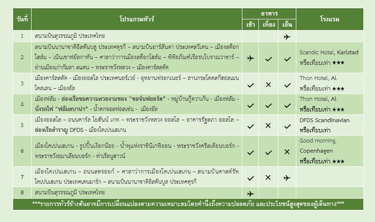 10.10 เดินทางถึง สนามบินอาร์ลันดา ประเทศสวีเดน ผ่านการตรวจคนเข้าเมืองรับสัมภาระผ่านจุดคัดกรองตามระเบียบของสนามบิน (เวลาท้องถิ่นช้ากว่าประเทศไทยประมาณ 5 ชั่วโมง)