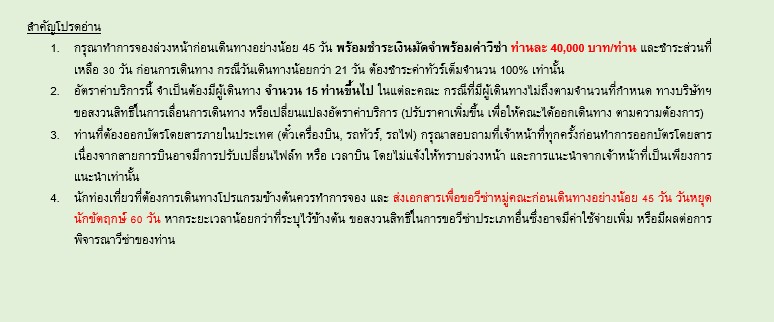 ** กรณีต้องการจองห้องพักแบบวิวทะเล (Sea View Cabin) กรุณาติดต่อเจ้าหน้าที่เป็นกรณีพิเศษ เพื่อตรวจสอบห้องว่าง โดยมีค่าใช้จ่ายเพียง ราคา 3,000 บาทต่อท่าน โดยชำระค่าบริการส่วนนี้ทันทีที่ห้องพักถูกยืนยันจากต่างประเทศ รวมไปถึงกรณีที่ห้องพักแบบปกติ (Inside Cabin) เต็ม ไม่ว่ากรณีใดก็ตาม และทางบริษัทจำเป็นต้องจห้องพักในระดับมากกว่ามาตรฐานที่กำหนดไว้กับราคาค่าทัวร์ (Upgrade) ทางบริษัทขอสงวนสิทธิ์ในการเรียกเก็บค่าใช้จ่ายที่เกิดขึ้นตามจริงกับผู้เดินทาง ทั้งนี้ทางบริษัทจะคำนึงถึงประโยชน์ของลูกค้าเป็นสำคัญ **