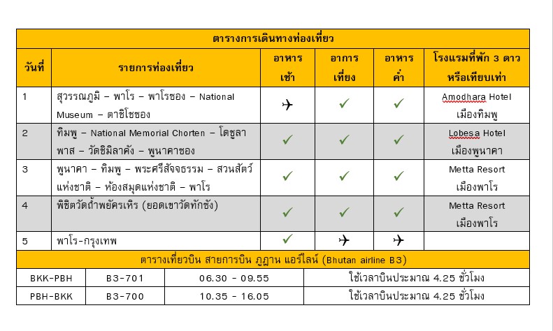 04.30 น. คณะพบกัน ณ จุดนัดหมาย สนามบินสุวรรณภูมิ ชั้น 4 เคาน์เตอร์สายการบิน Bhutan Airlines (B3) โดยจะมีเจ้าหน้าที่ของบริษัทฯ คอยอำนวยความสะดวกในการ Check-inสัมภาระต่างๆแก่ท่าน