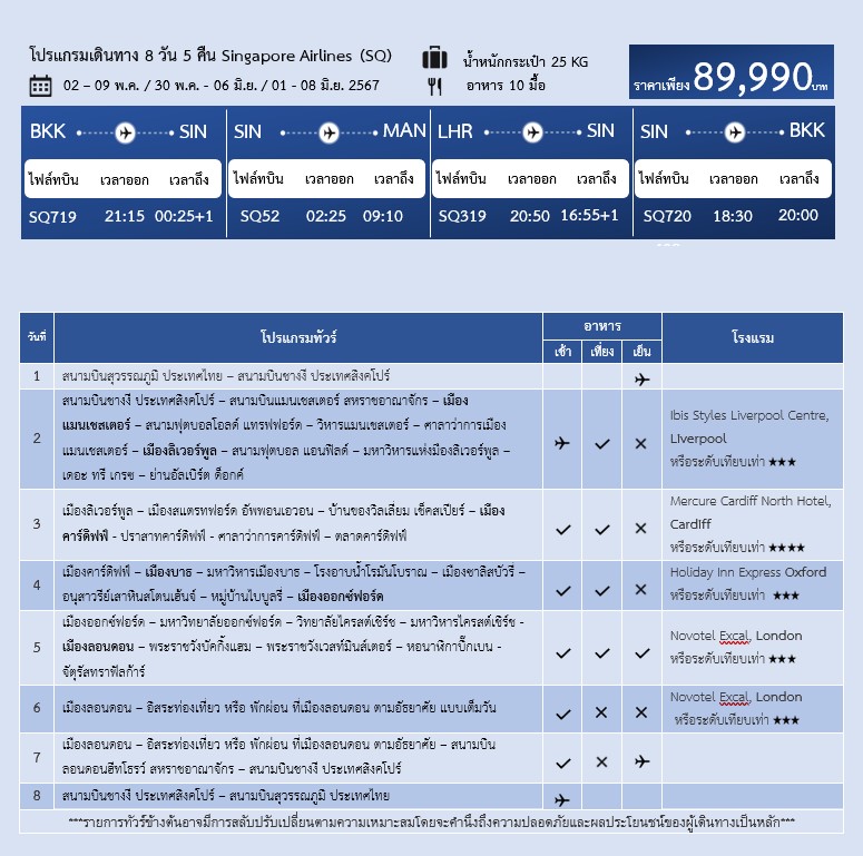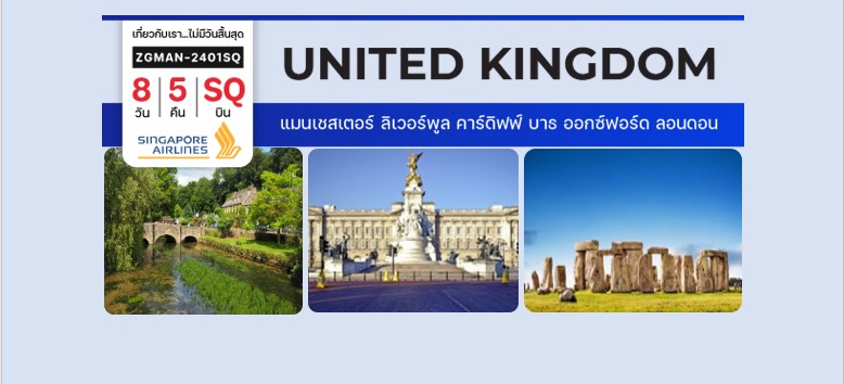 02.25 นำท่านออกเดินทางสู่ สนามบินแมนเชสเตอร์ เมืองแมนเชสเตอร์ ประเทศอังกฤษ โดยสายการบิน Singapore Airlines เที่ยวบินที่ SQ52 (บริการอาหาร และเครื่องดื่มบนเครื่อง) ใช้เวลาในการเดินทาง ประมาณ 9 ชั่วโมง 15 นาที
