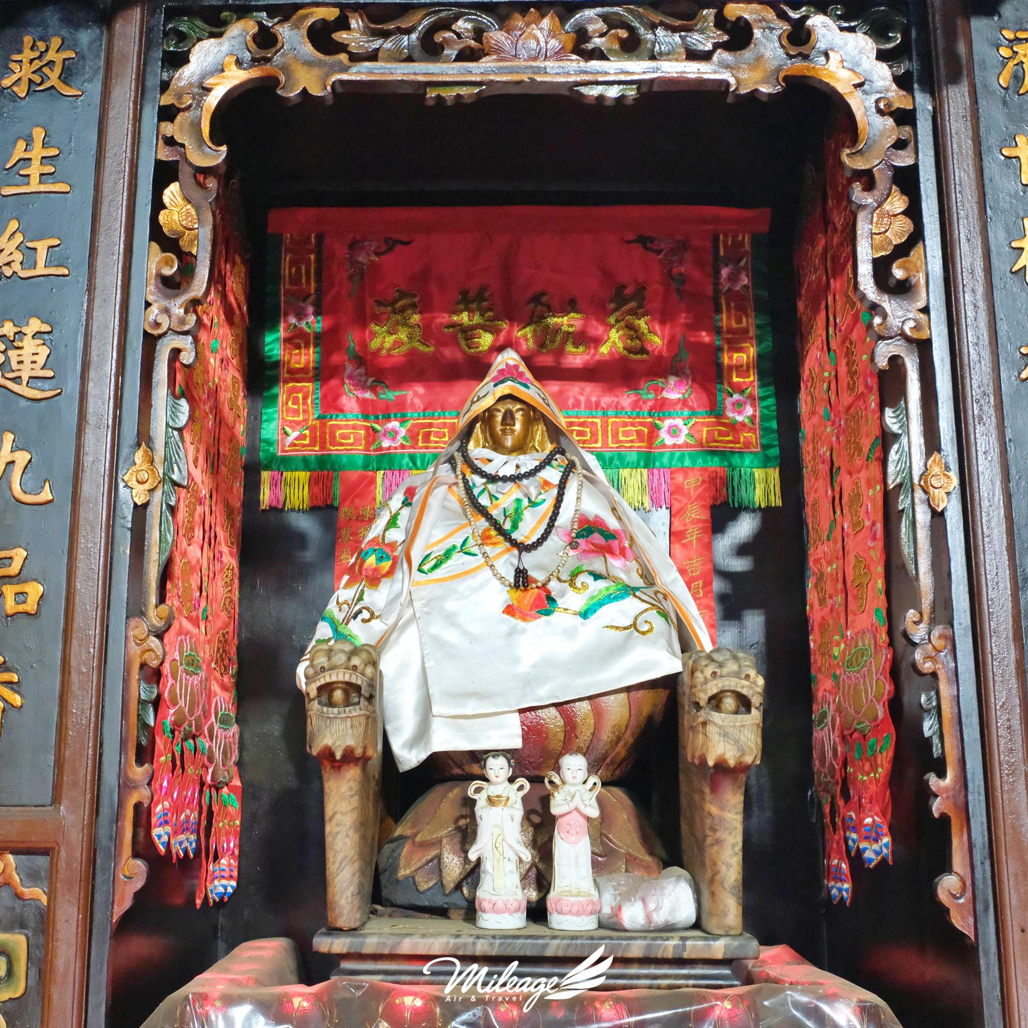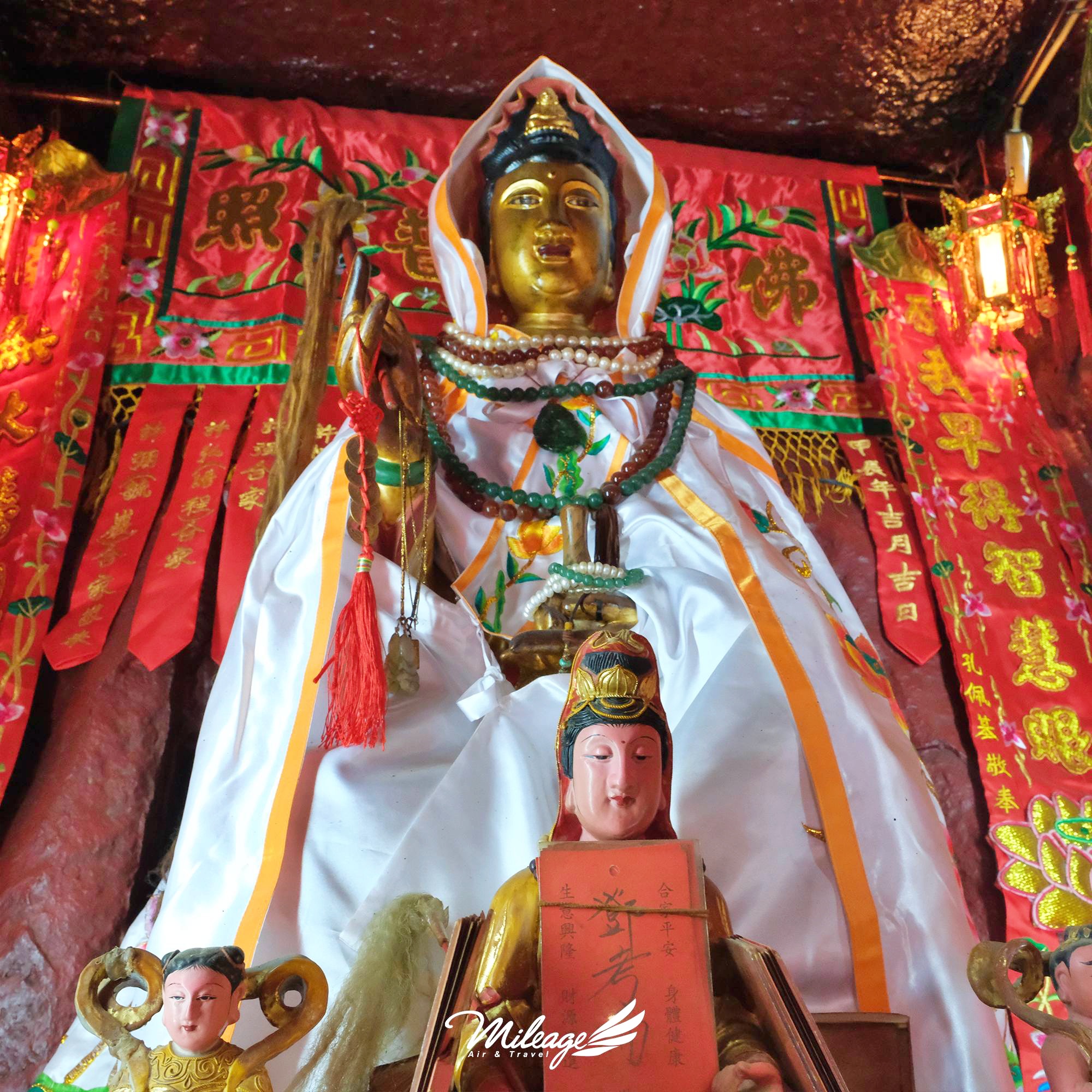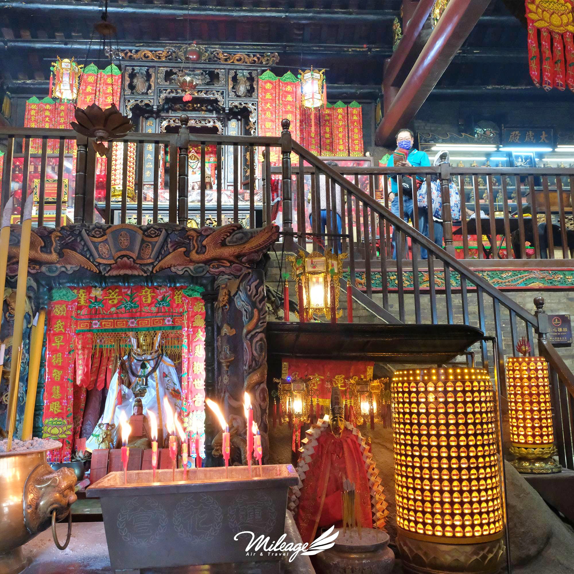 เดินผ่านประตูบานเล็กด้านข้างฝั่งซ้ายของตัววัดเข้าไป จะพบกับประตูทรงโค้งโดยรอบที่แบ่งระหว่างภายในวิหารและภายนอก เมื่อผ่านประตูเข้าไปแล้ว จะพบว่าทางขวามือคือที่ประทับของเจ้าแม่กวนอิมและเทพฮ่าวจื่อเอี๊ย โดยเจ้าแม่กวนอิมองค์ประธานจะอยู่ที่ชั้นล่าง มีบันไดเดินขึ้นชั้นลอยซึ่งเป็นที่ประทับของเจ้าแม่กวนอิมองค์เล็กและเทพเจ้าไท้ส่วยเอี๊ย