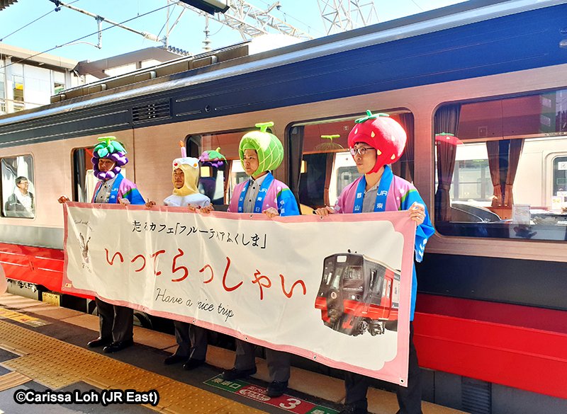 อีกสิ่งหนึ่งที่เป็นเอกลักษณ์ของญี่ปุ่นคือจิตวิญญาณแห่งโอโมเตนาชิ (おもてなし การต้อนรับ) ซึ่งการต้อนรับนี้ไม่ได้จำกัดเฉพาะบนรถไฟเท่านั้น แต่รวมถึงบนชานชาลาก่อนออกเดินทางจากสถานีโคริยามะด้วยค่ะ จะมีพนักงานใส่หมวกผลไม้ยืนถือป้ายที่เขียนว่า “いってらっしゃい Have a nice trip” คอยยืนอำลาเราอยู่ ถ้าคุณมีเวลาก่อนออกเดินทางก็สามารถถ่ายภาพพวกเขาเก็บไว้ได้